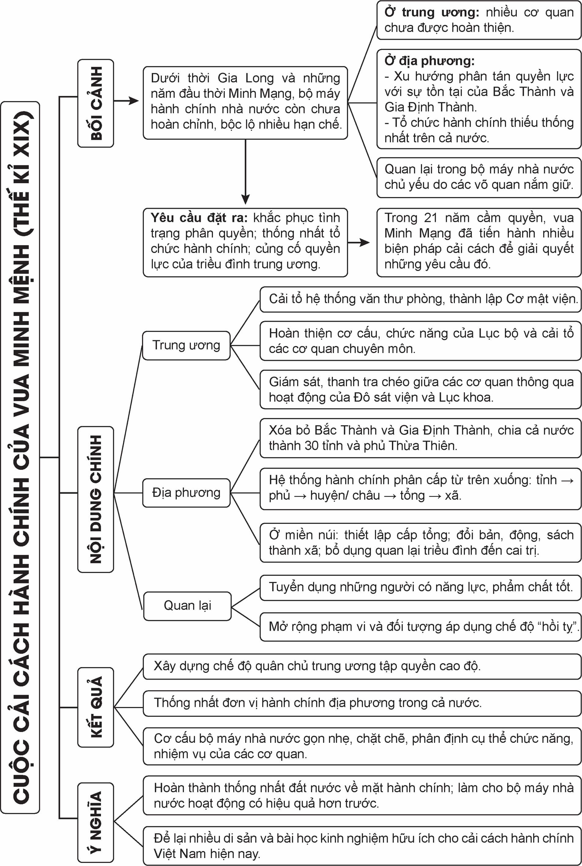Lập sơ đồ tư duy tóm tắt bối cảnh, nội dung chính và ý nghĩa của cuộc cải cách Minh Mạng.