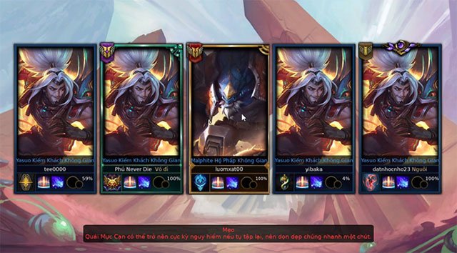 Khi đối đầu với trùm cuối Kayn sau khi Kayn hút hồn dùng 4 tướng tường gió 1 lúc. 2 tướng đánh trước, 2 tướng sau sẽ dồn sát thương liên tục mà không sợ bị dính dame. Cần phối hợp ăn ý tránh để mất time hồi chiêu ulti của Malphite và thay nhau tường gió ở cuối trận.