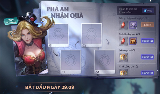 Bắt đầu từ ngày 29/9 cho đến hết 12/10, game thủ Liên Quân Mobile VN sẽ chính thức được tham gia sự kiện nhận miễn phí skin mới Sephera Phi vụ thế kỷ. Cô nàng trợ thủ có lượng hồi máu rất tốt này hiện đang có lượng fan tương đối nên skin này lại càng được nhiều người mong chờ hơn.