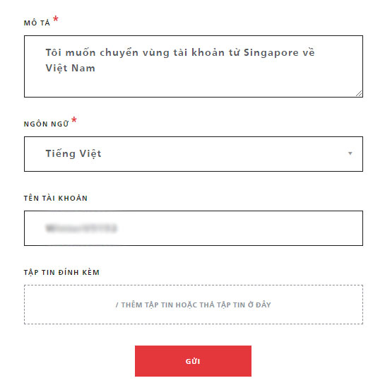 Phần mô tả các bạn cũng điền tương tự như phần chủ đề: Tôi muốn chuyển vùng tài khoản từ Singapore về Việt Nam. Ngôn ngữ các bạn để Tiếng Việt, và điền tên tài khoản của bạn vào ô Tên tài khoản. Sau khi làm xong, hãy nhấn nút Gửi ở cuối trang.