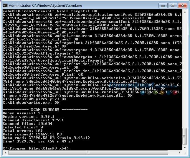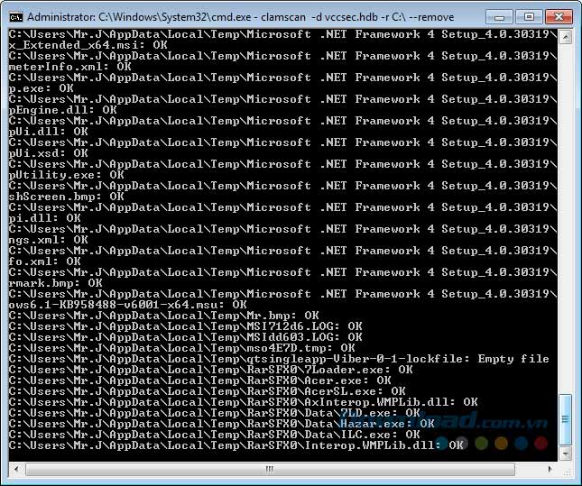 Thực hiện lệnh C:\Program Files\ClamAV-x64>clamscan -d vccsec.hdb -r C:\ --remove