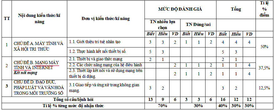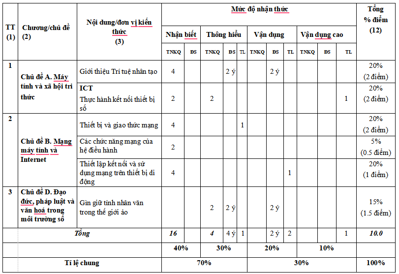 + Mức độ đề: 70% trắc nghiệm (40 % Nhận biết; 20 % Thông hiểu; 10% Vận dụng), 30% tự luận (10% Thông biểu, 10% Vận dụng; 10% Vận dụng cao).