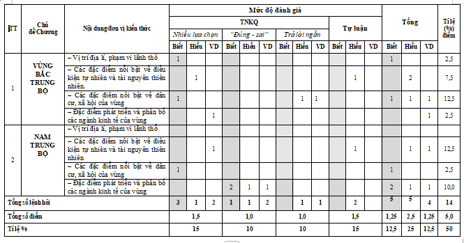 1. Về kiến thức: Kiểm tra sự lĩnh hội của HS về kiến thức đã học của các vùng: Bắc Trung Bộ, Nam Trung Bộ.