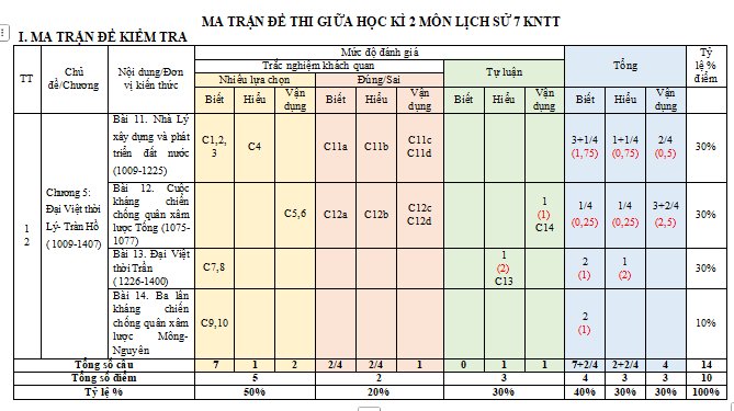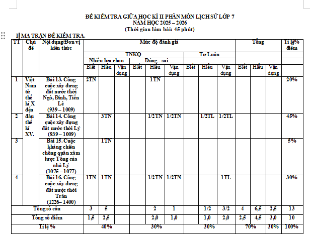 Lưu ý: Ma trận đề kiểm tra giữa học kì 2 Lịch sử 7 gồm: