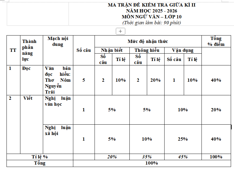 Tìm hiểu thêm »Ma trận đề thi giữa học kì 2 môn Ngữ văn 10 năm 2025 - 2026 mang đến ma trận, bản đặc tả chi tiết theo sách Kết nối tri thức và Chân trời sáng tạo với cấu trúc 4-6 và 5-5.