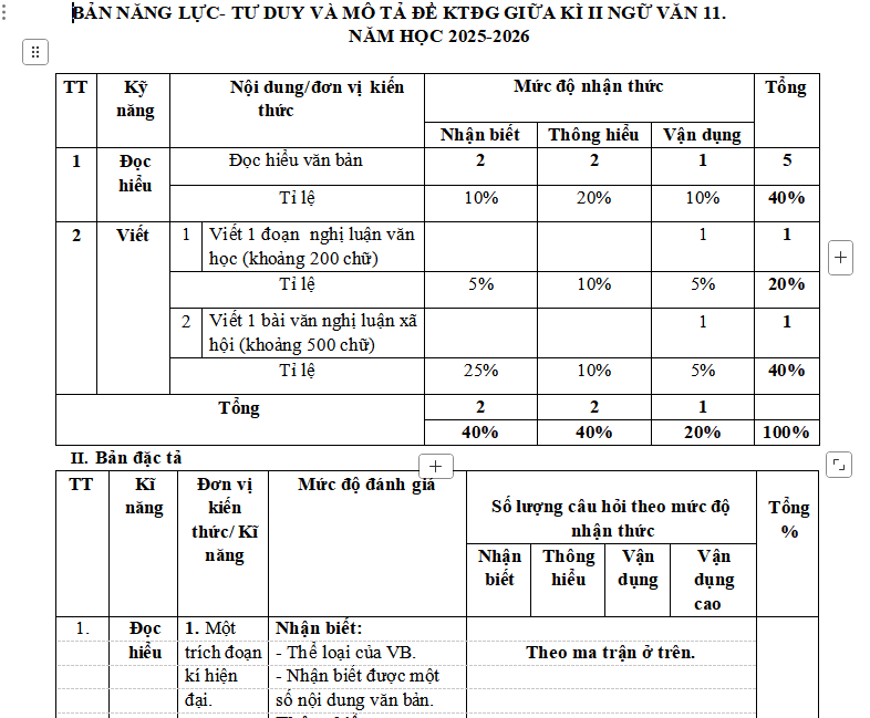 Tìm hiểu thêm »Ma trận đề thi giữa học kì 2 môn Ngữ văn 11 năm 2025 - 2026 mang đến ma trận, bản đặc tả chi tiết theo sách Kết nối tri thức với cấu trúc 4-6 và 6-4.