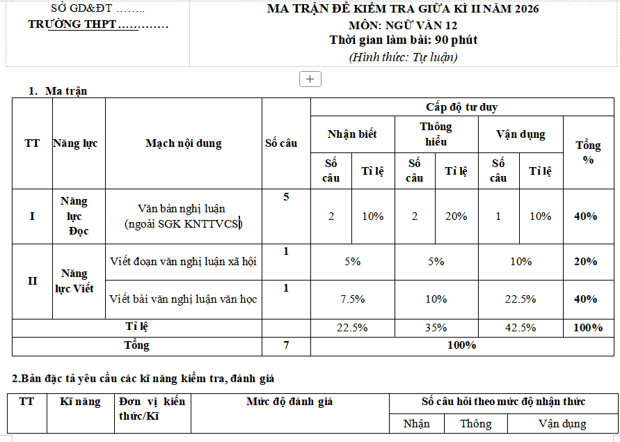 Tìm hiểu thêm »Ma trận đề thi giữa học kì 2 môn Ngữ văn 12 năm 2025 - 2026 mang đến ma trận, bản đặc tả chi tiết theo sách Kết nối tri thức với cấu trúc 4-6.