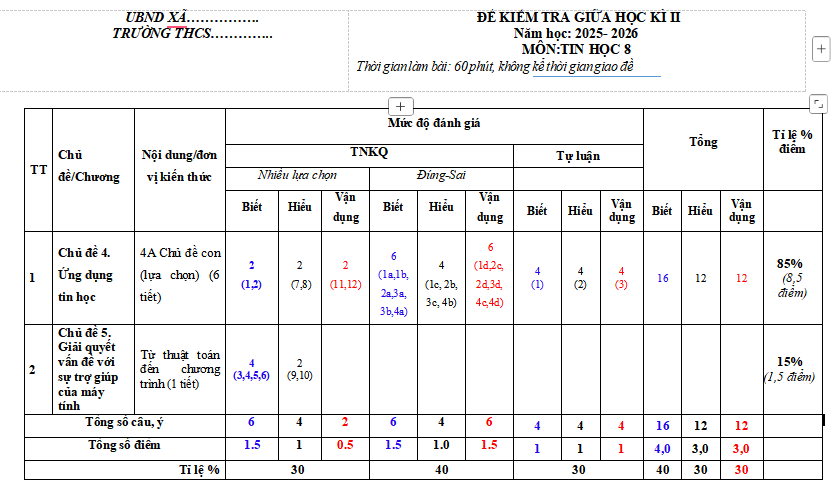 Lưu ý: Ma trận đề kiểm tra giữa kì 2 Tin học 8 Kết nối tri thức có cấu trúc như sau. Tùy theo yêu cầu của từng Sở mà quý thầy cô ra đề kiểm tra phù hợp với địa phương mình
