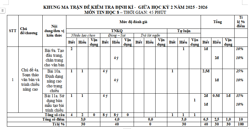 Tìm hiểu thêm »Ma trận đề thi giữa học kì 2 môn Tin học 8 năm 2025 - 2026 mang đến ma trận, bản đặc tả chi tiết theo sách Kết nối tri thức với cấu trúc 3-4-3 với 2 mẫu khác nhau.