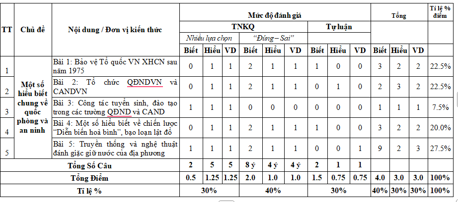 Ma trận đề kiểm tra học kì 1 Giáo dục Quốc phòng 12 gồm:
