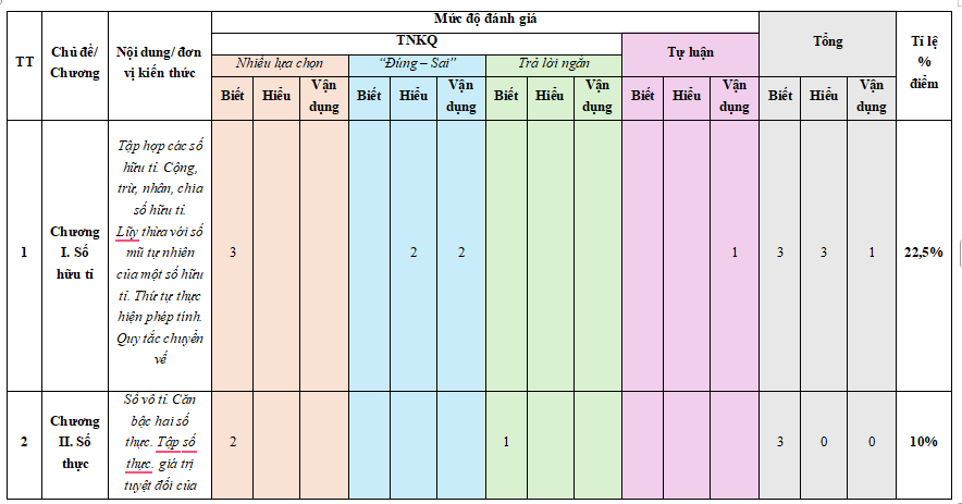 Ma trận đề kiểm tra học kì 1 Toán 7 năm 2025 được trình bày dưới dạng file Word rất thuận tiện để quý thầy cô tải về chỉnh sửa theo ý của riêng mình. Ma trận bản đặc tả đề kiểm tra cuối kì 1 Toán lớp 7 giúp giáo viên xác định rõ chuẩn kiến thức, kĩ năng, năng lực cần đánh giá, bảo đảm đề kiểm tra bám sát mục tiêu chương trình GDPT 2018 và phân bổ hợp lý giữa các mức độ nhận thức đúng hướng, khoa học, công bằng. Ngoài ra các bạn xem thêm ma trận đề thi học kì 1 Địa lí 7, ma trận đề thi cuối kì 1 Tin học 7 và nhiều tài liệu khác tại chuyên mục đề thi học kì 1 lớp 7.