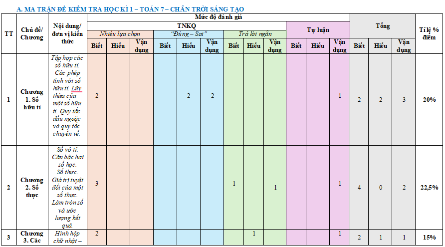 Ma trận đề thi học kì 1 môn Toán 7 năm 2025 gồm: