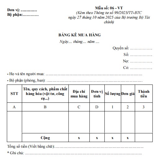 Mẫu bảng kê mua hàng Mẫu số 06-VT theo Thông tư 992025/TT-BTC