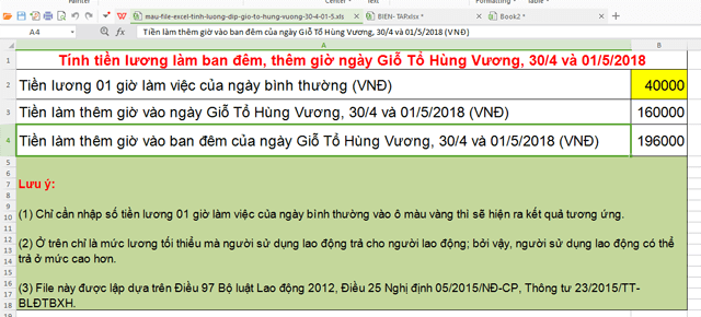 2. File Excel tính tiền lương dịp Giỗ Tổ Hùng Vương, 30/4, 01/5/2018