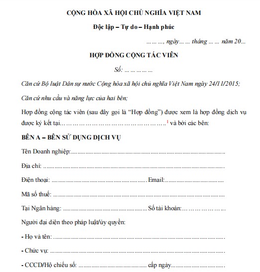 Hợp đồng cộng tác viên (sau đây gọi là “Hợp đồng”) được xem là hợp đồng dịch vụ được ký kết tại…………………………………………..1 và bởi các bên: