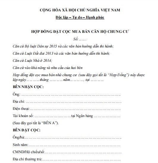 HỢP ĐỒNG ĐẶT CỌC MUA BÁN CĂN HỘ CHUNG CƯ
