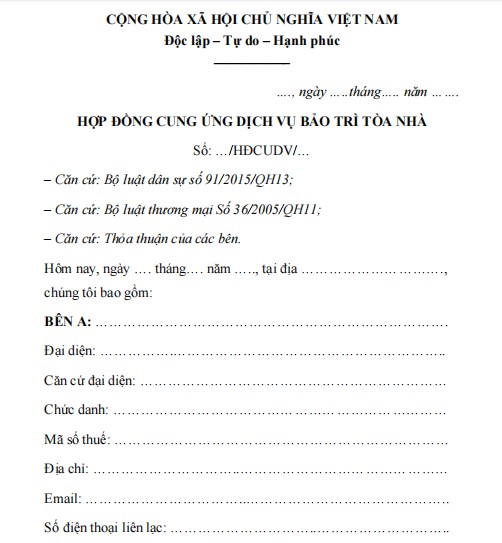 HỢP ĐỒNG CUNG ỨNG DỊCH VỤ BẢO TRÌ TÒA NHÀ