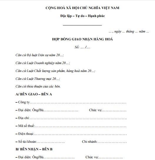 Nội dung hợp đồng thường bao gồm thông tin về đối tượng hàng hóa, phương thức giao nhận, trách nhiệm của các bên, điều khoản thanh toán và các quy định liên quan khác. Việc sử dụng mẫu hợp đồng giao nhận hàng hóa giúp doanh nghiệp, tổ chức và cá nhân chuẩn hóa quy trình làm việc, nâng cao tính minh bạch, đồng thời tạo sự tin tưởng trong quan hệ hợp tác thương mại. Đây là tài liệu cần thiết để bảo đảm hoạt động kinh doanh diễn ra thuận lợi, đúng pháp luật và hiệu quả, mời các bạn cùng tham khảo.