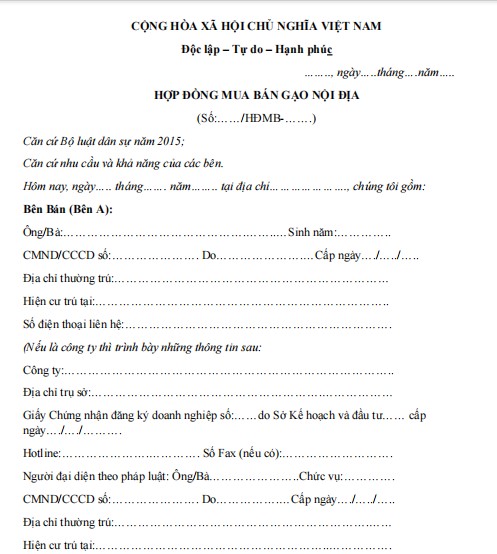 HỢP ĐỒNG MUA BÁN GẠO NỘI ĐỊA