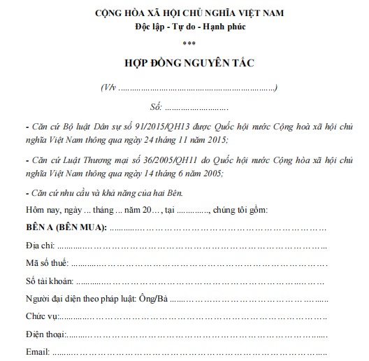 Tìm hiểu thêm »Hợp đồng nguyên tắc là một loại văn bản thỏa thuận có tính khung, được các bên ký kết trước khi đi vào các giao dịch cụ thể, nhằm xác định những điều khoản cơ bản và lâu dài trong quan hệ hợp tác. Khác với hợp đồng chi tiết, hợp đồng nguyên tắc thường quy định các nội dung mang tính định hướng như phạm vi hợp tác, nguyên tắc định giá, phương thức thanh toán, trách nhiệm chung cũng như thời hạn hiệu lực của thỏa thuận. Văn bản này đặc biệt hữu ích trong các mối quan hệ mua bán hàng hóa, cung ứng dịch vụ hoặc gia công theo chu kỳ dài, nơi các đơn hàng phát sinh thường xuyên nhưng không cần thiết phải soạn thảo lại toàn bộ hợp đồng mỗi lần.