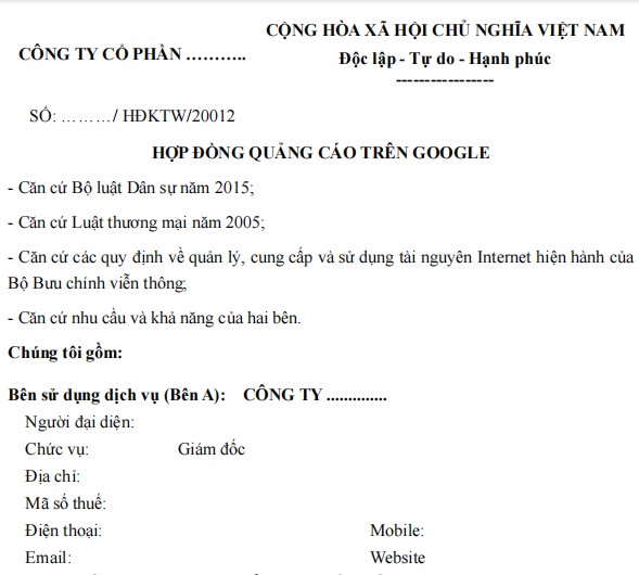 Dưới đây là mẫu Hợp đồng quảng cáo trên Google được trình bày đầy đủ, rõ ràng, phù hợp để các doanh nghiệp, cá nhân và đơn vị cung cấp dịch vụ tham khảo và áp dụng trong thực tế.