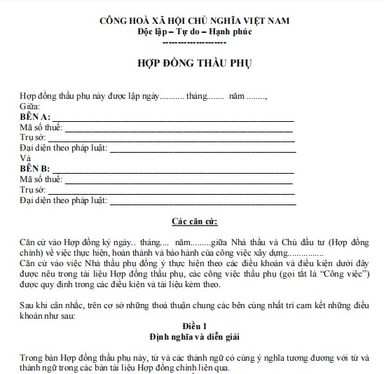 Một hợp đồng thầu phụ chuẩn cần thể hiện đầy đủ các nội dung cơ bản như thông tin các bên, phạm vi công việc, tiến độ thực hiện, giá trị hợp đồng, phương thức thanh toán, điều khoản bảo hành, cũng như các cam kết về an toàn và chất lượng. Việc sử dụng mẫu hợp đồng thầu phụ giúp doanh nghiệp, nhà thầu chính và thầu phụ dễ dàng thỏa thuận, hạn chế rủi ro, đồng thời tạo cơ sở để giải quyết tranh chấp nếu phát sinh. Đây là tài liệu hữu ích, phù hợp để tham khảo và áp dụng trong thực tế, mời các bạn cùng tham khảo.