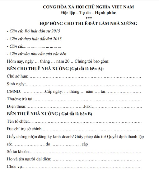 HỢP ĐỒNG CHO THUÊ ĐẤT LÀM NHÀ XƯỞNG