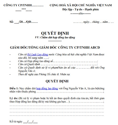 Điều 1: Nay chấm dứt hợp đồng lao động với Ông Nguyễn Văn A, là cán bộ/công nhân viên thuộc phòng …………………………………………………………….;