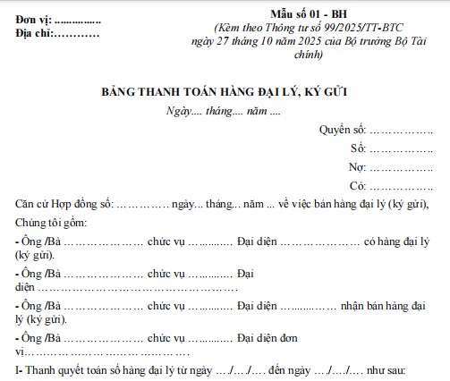 Bảng thanh toán hàng đại lý, ký gửi Mẫu 01-BH theo Thông tư 99/2025/TT-BTC