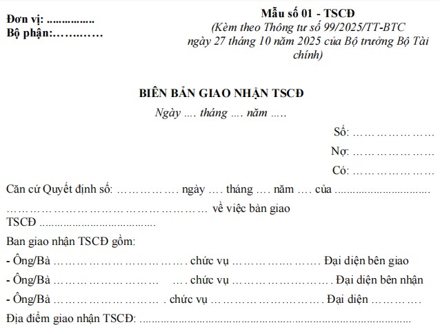 Biên bản giao nhận tài sản cố định Mẫu 01-TSCĐ theo Thông tư 99/2025/TT-BTC mới nhất