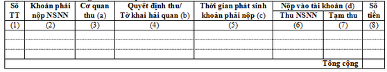 (a) Cơ quan quản lý thu nơi người nộp thuế còn nợ thuế; (b) Quyết định hành chính của cơ quan có thẩm quyền hoặc tờ khai hải quan; (c) Kỳ thuế, từ kỳ đến kỳ; (d) Đối với khoản phải nộp NSNN theo tờ khai, quyết định của cơ quan thu thì đánh dấu dấu “V” vào cột tài khoản “Thu NSNN”, đối với khoản thuế xuất nhập khẩu do cơ quan hải quan quản lý thì đánh dấu dấu “V” vào cột tài khoản “Tạm thu”, đồng thời ghi số tiền tương ứng theo dòng tại cột (8) “Số tiền”.