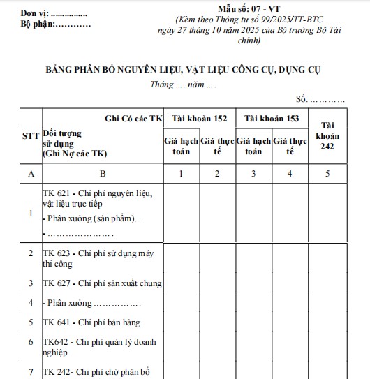 Mẫu số 07 - VT: Bảng phân bổ nguyên liệu, vật liệu, công cụ, dụng cụ được ban hành kèm theo Thông tư 99/2025/TT-BTC là biểu mẫu nghiệp vụ không thể thiếu đối với kế toán viên. Mẫu biểu này được thiết kế để tổng hợp và phân bổ giá trị các loại vật tư đã xuất dùng trong kỳ theo từng bộ phận sử dụng, từng công trình, hạng mục công trình hoặc từng loại sản phẩm. Việc lập Bảng phân bổ Mẫu 07-VT một cách khoa học, chính xác giúp đảm bảo tính hợp lý của chi phí sản xuất trong kỳ, đồng thời là căn cứ pháp lý quan trọng để ghi nhận vào sổ kế toán chi tiết và tổng hợp. Đây là công cụ đắc lực hỗ trợ doanh nghiệp kiểm soát chi phí và nâng cao hiệu quả quản trị tài chính, mời các bạn cùng tham khảo.
