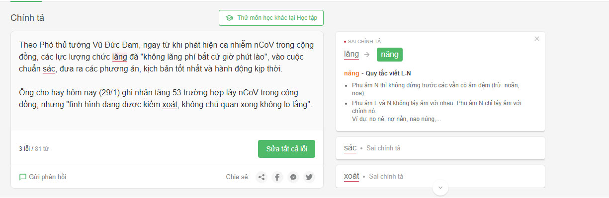 Copy hoặc đánh đoạn văn bản các bạn muốn kiểm tra chính tả vào sau đó nhấn nút Kiểm tra. Đoạn văn bản sau đó sẽ được Cốc Cốc chỉ ra các lỗi chính tả bằng cách gạch đỏ dưới chân và chú thích về các lỗi sai ở bên phải. Người dùng có thể sửa các lỗi này thủ công hoặc nhấn vào nút Sửa tất cả để sửa tự động các lỗi.