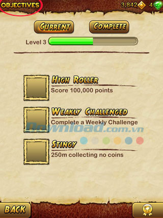 Từ màn hình chính, chọn Menu để truy cập thực đơn game. Tại trang thực đơn, chọn Objectives để xem 3 mục tiêu bạn cần đạt được cho level kế tiếp.
