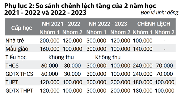 Học sinh thuộc các huyện Bình Chánh, Hóc Môn, Củ Chi, Nhà Bè và Cần Giờ bậc THPT, GDTX THPT sẽ tăng học phí từ 100.000 đồng/học sinh/tháng lên 200.000 đồng/học sinh/tháng (tăng 100.000 đồng/học sinh/tháng).