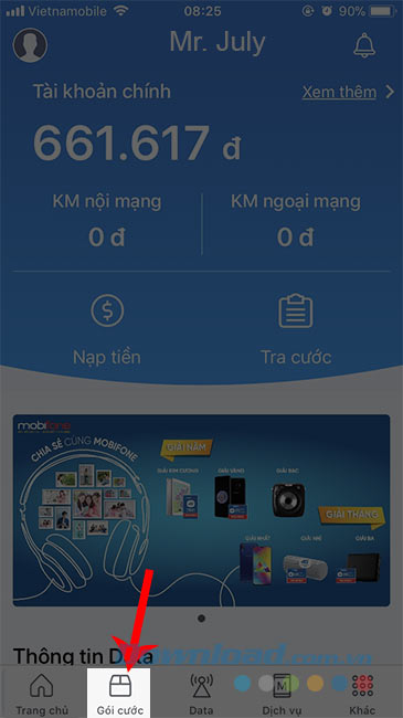 Bước 1: Các bạn mở ứng dụng My MobiFone trên điện thoại của mình lên và đăng nhập vào như bình thường. Tại giao diện chính, chọn vào mục Gói cước ở danh mục bên dưới màn hình.