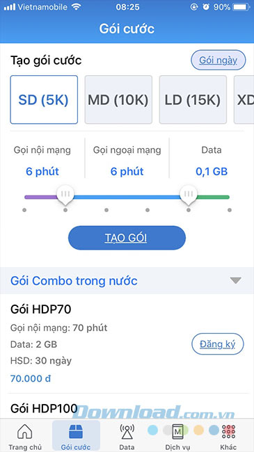 Bước 2: Tại đây, các bạn có thể thấy ngay trên đầu là phần để chúng ta Tạo gói cước, với các gói khá đa dạng và thích hợp, với giá chỉ từ 5.000VND/ngày.