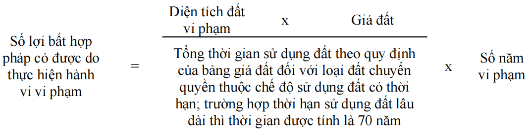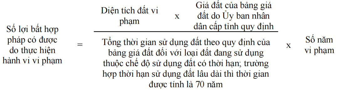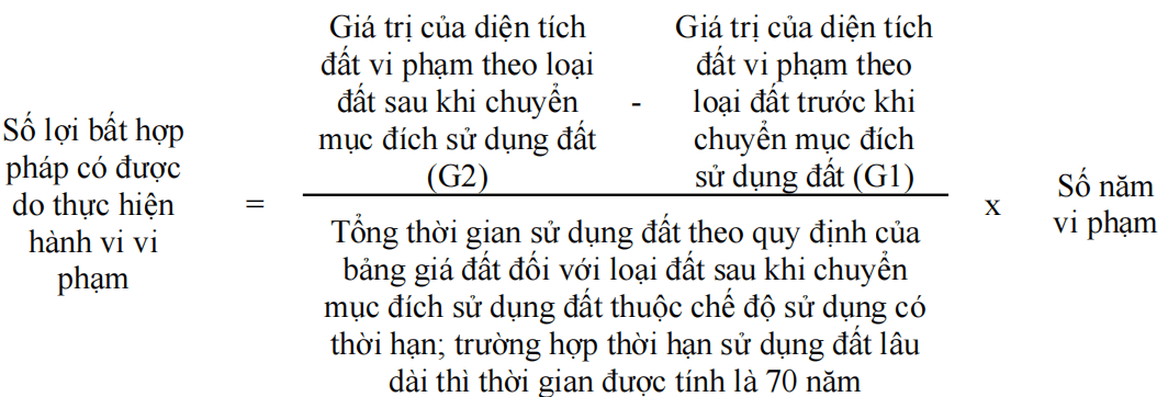 “1. Trường hợp sử dụng đất sang mục đích khác mà không được cơ quan nhà nước có thẩm quyền cho phép quy định tại các Điều 9, 10, 11, 12 và 13 Nghị định này thì số lợi bất hợp pháp có được do thực hiện hành vi vi phạm được xác định bằng giá trị chênh lệch của loại đất trước và sau khi vi phạm tính trên diện tích đất đã chuyển mục đích sử dụng đất trong thời gian vi phạm (kể từ thời điểm bắt đầu chuyển mục đích sử dụng đất đến thời điểm lập biên bản vi phạm hành chính). Giá đất của loại đất trước và sau khi vi phạm được xác định bằng giá đất của bảng giá đất do Ủy ban nhân dân cấp tỉnh quy định (đối với giá của loại đất trước khi vi phạm) và tại thời điểm lập biên bản vi phạm hành chính (đối với giá của loại đất sau khi chuyển mục đích). Số lợi bất hợp pháp có được do chuyển mục đích sử dụng đất được tính bằng công thức sau: