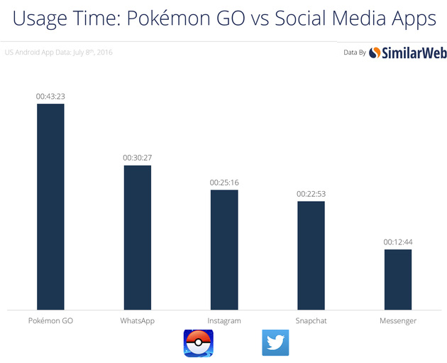 Không chỉ có thế, nếu muốn tìm thêm số liệu cho thấy sức nóng và sự hấp dẫn mà game này mang lại, hãy xem một người Mỹ trung bình bỏ ra bao nhiêu thời gian chơi Pokemon GO? Nếu từng bất ngờ với khoảng thời gian các "con nghiện Facebook" online hẳn bạn sẽ hốt hoảng hơn nữa khi biết thời gian một người chơi trung bình bỏ ra tới 43 phút / ngày để đi "săn Pokemon".
