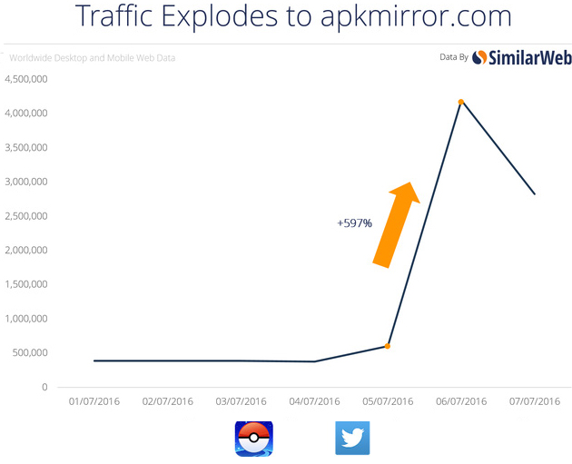 Không chỉ tại Mỹ, qua thống kê, SimilarWeb cũng đánh giá rằng, tại các Quốc gia chưa được phát hành chính thức Pokemon GO, số lượng người tìm cách "vượt rào" tăng theo cấp số nhân mỗi ngày. Tính riêng trên hệ điều hành Android, có lẽ vì có thể cài Pokemon GO bằng file APK nên số lượng người dùng tại trang apk****.com (một trang chuyên cung cấp các file APK cho người dùng) đã tăng đột biến từ xấp xỉ 500.000 lượt tải/ngày (05/7) lên tới hơn 4 triệu lượt tải/ngày (06/7).