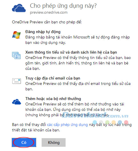 Bước 2: Đăng nhập tài khoản Microsoft mà bạn đang sử dụng cho dịch vụ OneDrive. Ngay sau đó sẽ có cửa sổ xác nhận yêu cầu mà Microsoft đưa ra, nhấn vào nút Có để cho phép OneDrive: