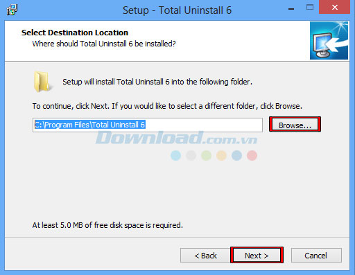 Bước 4: Theo mặc định, file cài đặt của Total Uninstall sẽ được lưu vào đường dẫn thư mục dưới đây: C:\Program Files\Total Uninstall 6. Nếu bạn muốn lựa chọn một thư mục khác, nhấn Browse và chọn Next.