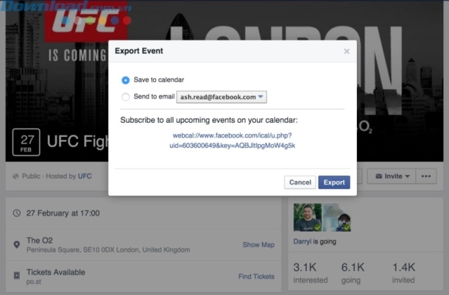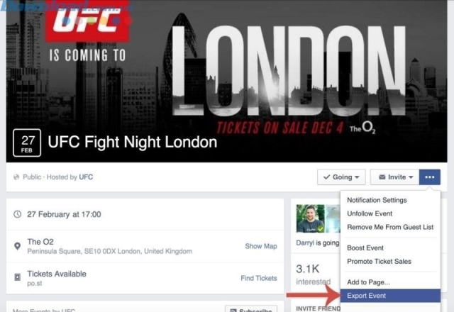 Khi đã vào trang sự kiện, hãy nhấp vào nút Tùy chọn (Options) và chọn Xuất sự kiện (Export Event) từ menu thả xuống.