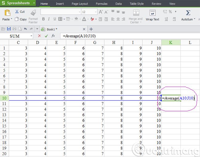 Kết quả đưa ra trong ô K10 là con số có giá trị trung bình giữa các ô từ A10 đến J10. Ngoài ra, bạn cũng có thể sử dụng con trỏ chuột kéo thả và đánh dấu chọn vùng dữ liệu hoặc có thể đồng thời nhấn phím Ctrl rồi nhấn chuột vào từng ô riêng rẽ trong trường hợp nếu các ô không nằm kế cận nhau.