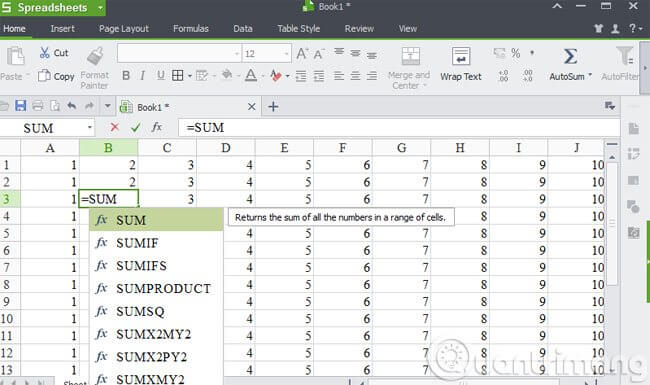 Đây có thể nói là hàm đầu tiên mà bất kỳ người dùng nào mới học Excel cũng cần phải biết đến. Giả sử, bạn muốn cộng các con số trong ô A2 và B2 lại với nhau, sau đó hiển thị kết quả trong ô B3. Để thực hiện, bạn chỉ cần di chuyển đến ô B3 và gõ cụm từ "=SUM" vào rồi chọn hàm =SUM vừa xuất hiện trong danh sách nổi lên.