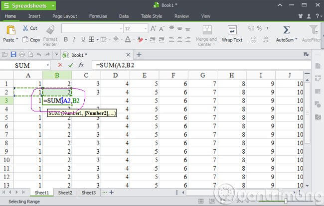 Tiếp theo, hãy nhấn phím Ctrl cùng với thao tác nhấn chuột chọn vào ô A2 và B2 rồi cuối cùng là nhấn phím Enter. Kết quả tổng của hai con số trong hai ô A2 và B2 mà bạn vừa chọn sẽ xuất hiện tức thì trong ô B3. Bạn có thể sử dụng hàm SUM để tính tổng của hai hay nhiều ô, chỉ với thao tác chọn thêm những ô cần thiết vào trong nội dung của hàm.