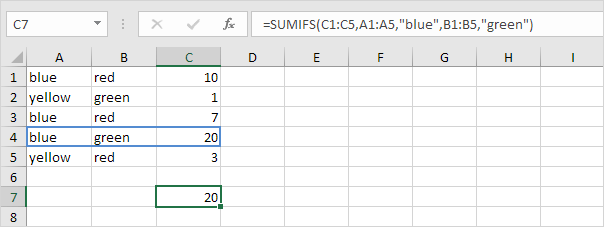 Để tính tổng các ô dựa trên nhiều điều kiện (ví dụ, blue và green), hãy sử dụng hàm SUMIFS sau (đối số đầu tiên là phạm vi bảng tính cần tính tổng).