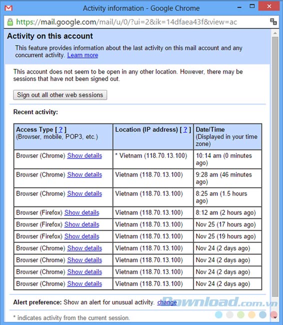 Một cửa sổ mới xuất hiện, trong đây là danh sách truy cập vào tài khoản Gmail của các bạn, kiểm tra để xem có gì bất thường hay không, và cần thiết thì nhấp chọn Sign out all other web sessions để thoát tất cả các phiên đang làm việc.