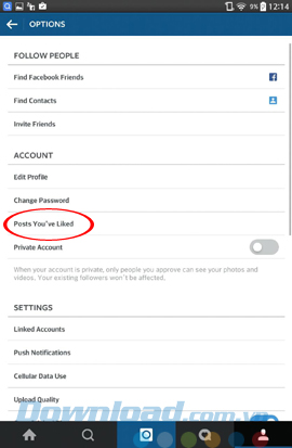 Truy cập vào mục Options, trong Account, chọn Posts you've liked. Một giao diện mới sẽ hiện ra và những bức ảnh mà từ trước tới tài khoản của bạn đã "thích" sẽ xuất hiện cho bạn xem lại và thao tác.