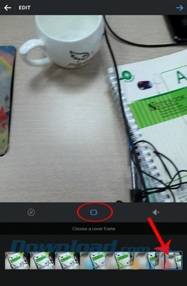 Trước khi đăng video lên tường nhà mình, các bạn chọn vào biểu tượng hình vuông ở giữa (Choose a cover frame) để chọn một ảnh bất kỳ làm ảnh đại diện cho video đó.
